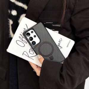 Elevate the look and functionality of your Samsung S23 Ultra or S24 Ultra with the Premium Carbon Fiber Magnetic Kickstand Case. This case features a sophisticated carbon fiber texture and an integrated MagSafe-compatible magnetic ring holder, offering both style and convenience. The foldable kickstand allows for hands-free viewing, making it ideal for streaming, video calls, or multitasking. Designed with precision cutouts, it ensures full compatibility with all ports, buttons, and cameras of the S23 and S24 Ultra models.